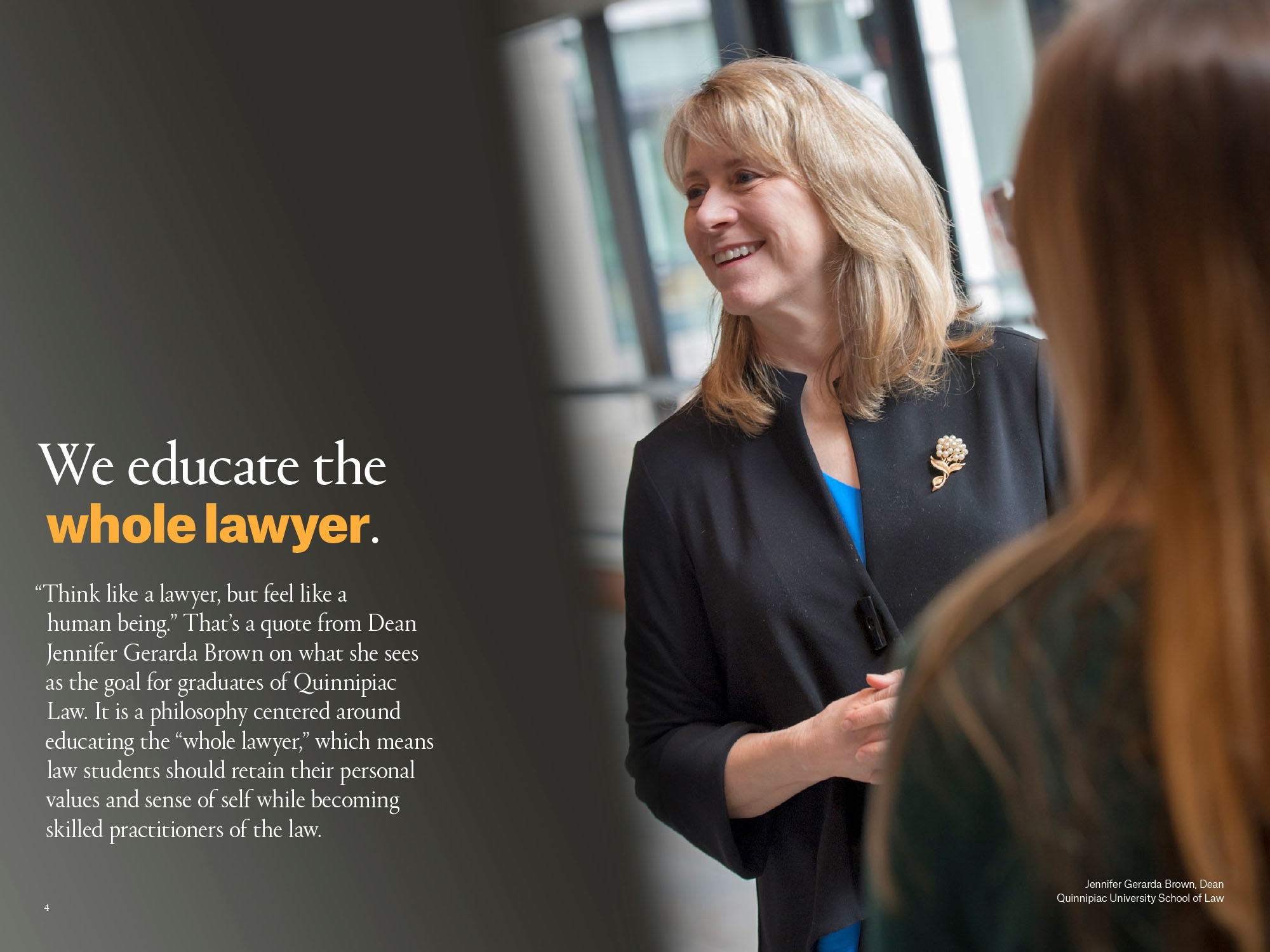 Building on their mission to “educate the whole lawyer”, we designed Quinnipiac University School of Law’s recruiting communications to express that ethos through intriguing messaging and emotive imagery. The Viewbook centers on a “Point/Counterpoint” device that showcases the “human” side of lawyering at the core of Quinnipiac Law’s unique curriculum. Graphically, the recruiting suite brings fresh vibrancy to well-established brand architecture.